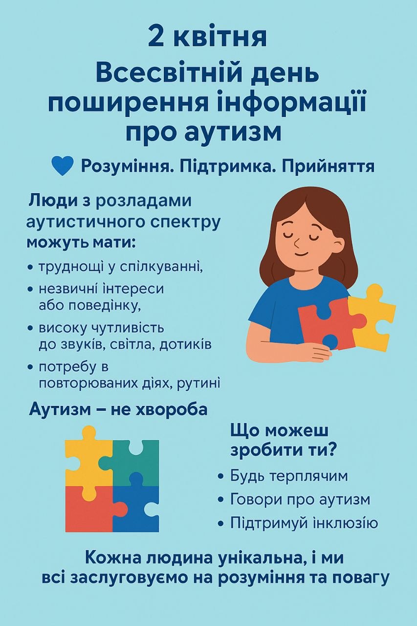 💙У стінах нашого навчально-реабілітаційного центру ми щодня працюємо над тим, щоб кожна дитина відчувала себе прийнятою та зрозумілою. 2 квітня ми традиційно долучилися до світової ініціативи, присвяченої поширенню знань про аутизм.Наші вихованці разом із педагогами організували тематичну акцію підтримки. Синій колір, який став символом цього дня, об’єднав нас через спільну творчість: створення плакатів, синіх сердець та святкових інсталяцій із кульок.Для нашого закладу це не просто дата в календарі, а можливість ще раз наголосити на важливості фахової реабілітації та рівних можливостей для кожного.Ми створюємо простір рівних можливостей, де кожна дитина з розладами аутистичного спектра має шанс на успішну соціалізацію та щасливе дитинство.Разом долаємо бар’єри!💙